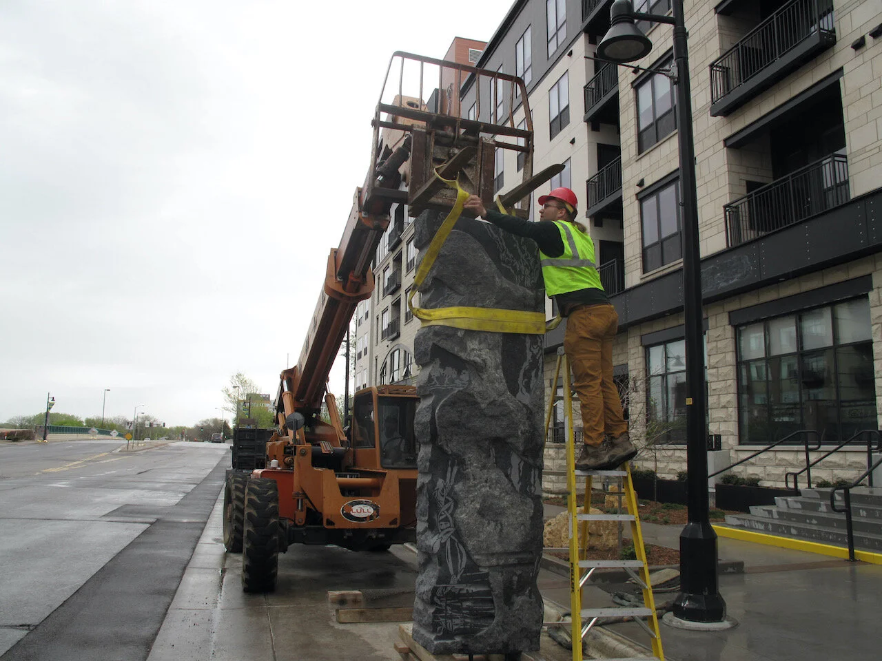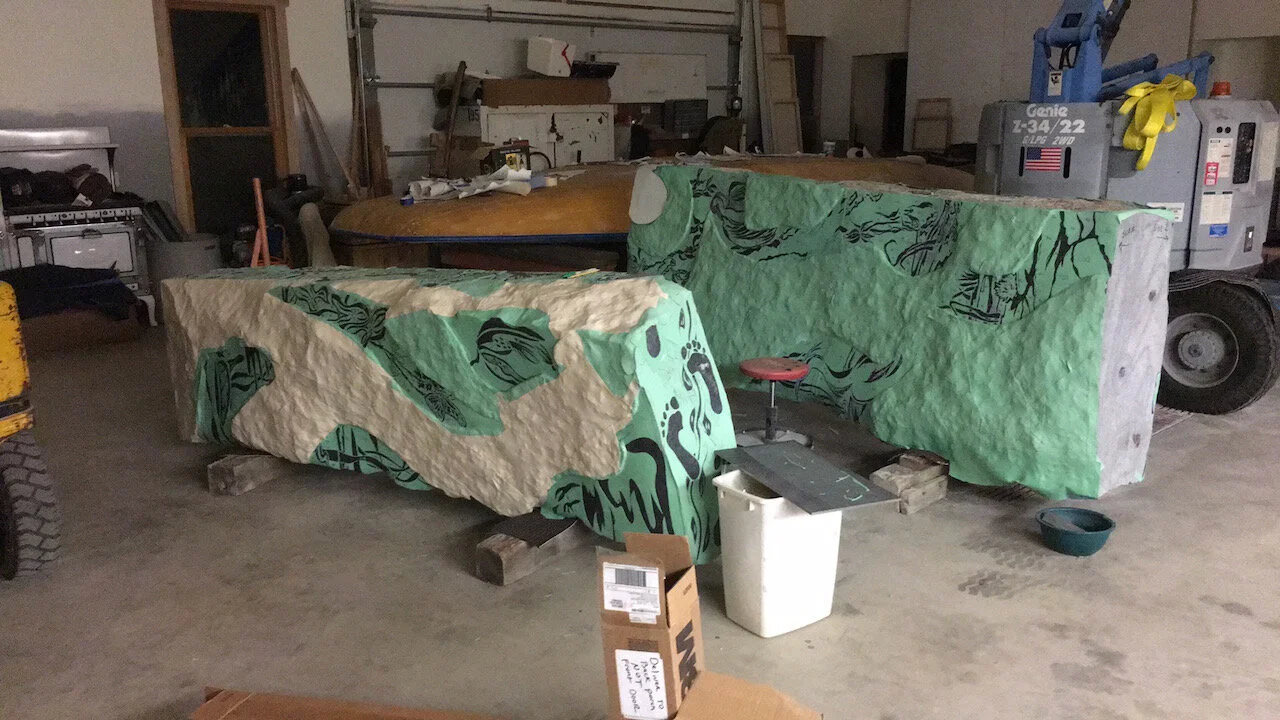 In 2020 I collaborated with artist Craig David on The Elmwood Development project which involved the splitting, grinding, polishing, designing, and sandblasting of two, 6000 pound granite monoliths. The process was intuitive, responding to the shapes naturally occurring in the stone. Through this intuitive design process, vague figures emerged from the facets of the stones. Attention was paid to maintain the natural surface of the stone in contrast to the highly polished areas later carved and filled with native animal and plant life.