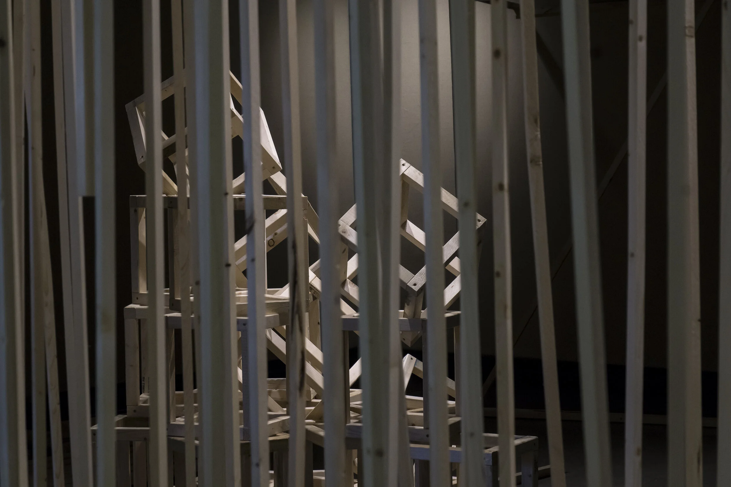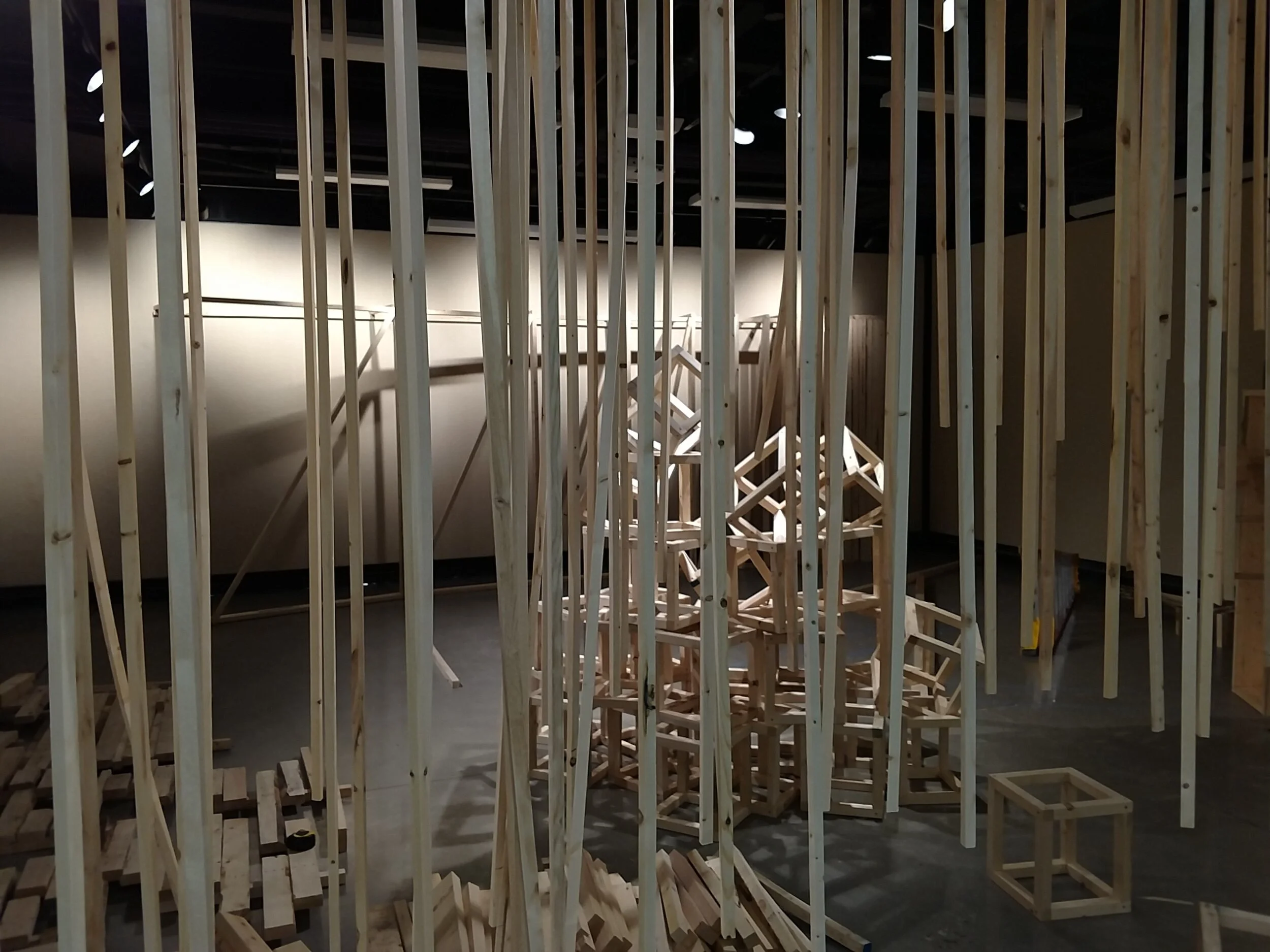 As a response to the gallery, the entire collaboration reflected architectural space in some manner. This collaboration consisted strictly of the transformation of dimensional 2”x4” lumber. Our three person group facilitated the cutting and construction of over three hundred sticks that were once 2”x4” lumber into the hanging forest of sticks which could be experienced by touch, sight, smell and sound. The form this piece took was established in conjunction with the placement of the other individual group’s work. This encouraged play in the space as occupants passed through this wooden curtain and interacted with the other fragments of construction. The project addressed a common industrial material and allowed a transformation of potentially utilitarian and mundane materials into a playful exploration of space.